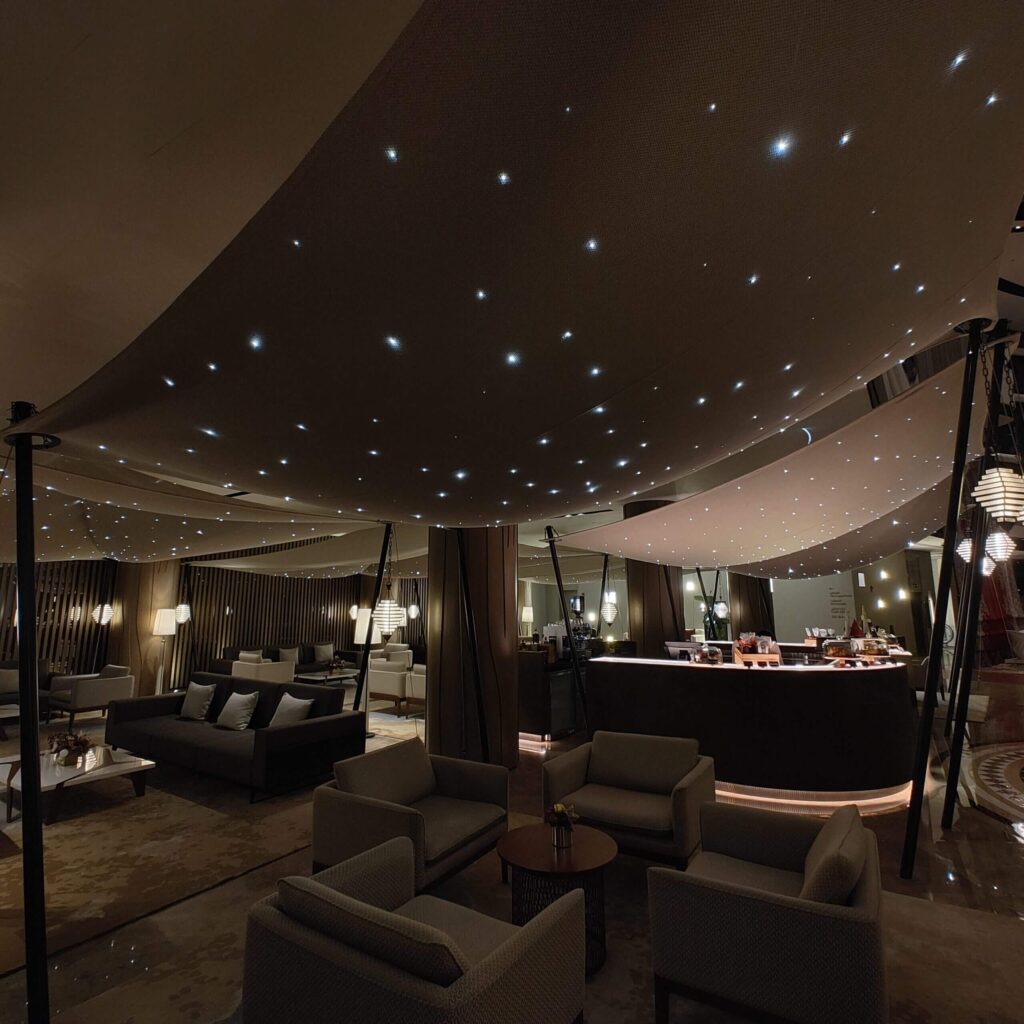 A specialty we have honed over the years and a difficult installation that requires precision and a specialist installation technique that ultimately delivers shimmering stars basking in swaths of fabric. We have installed these airy romantic lighting systems across the spectrum from stunning restaurants to exclusive dinner cruise Dhows spreading sprinkles of starlight across the Arabian lands from the desert to the sea.