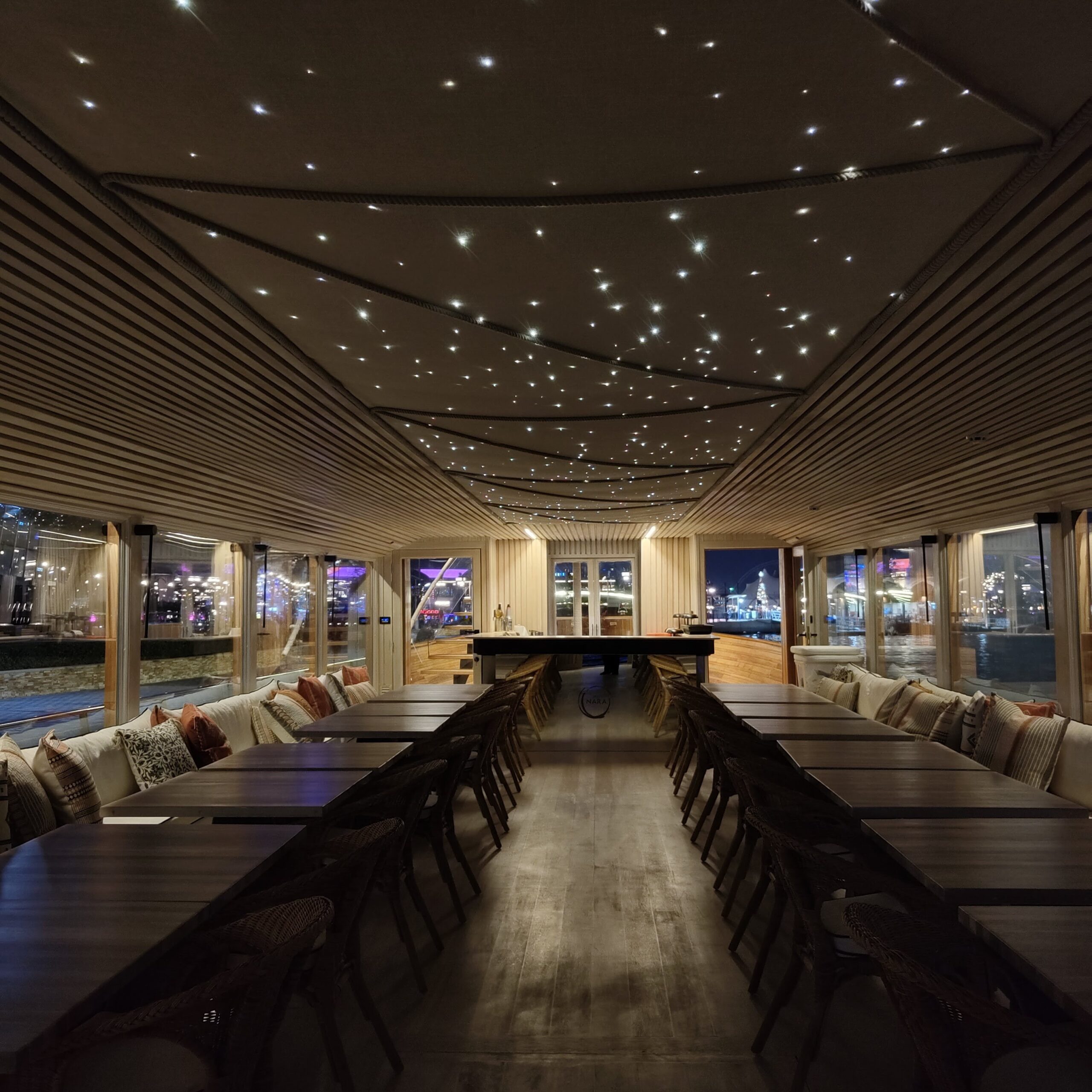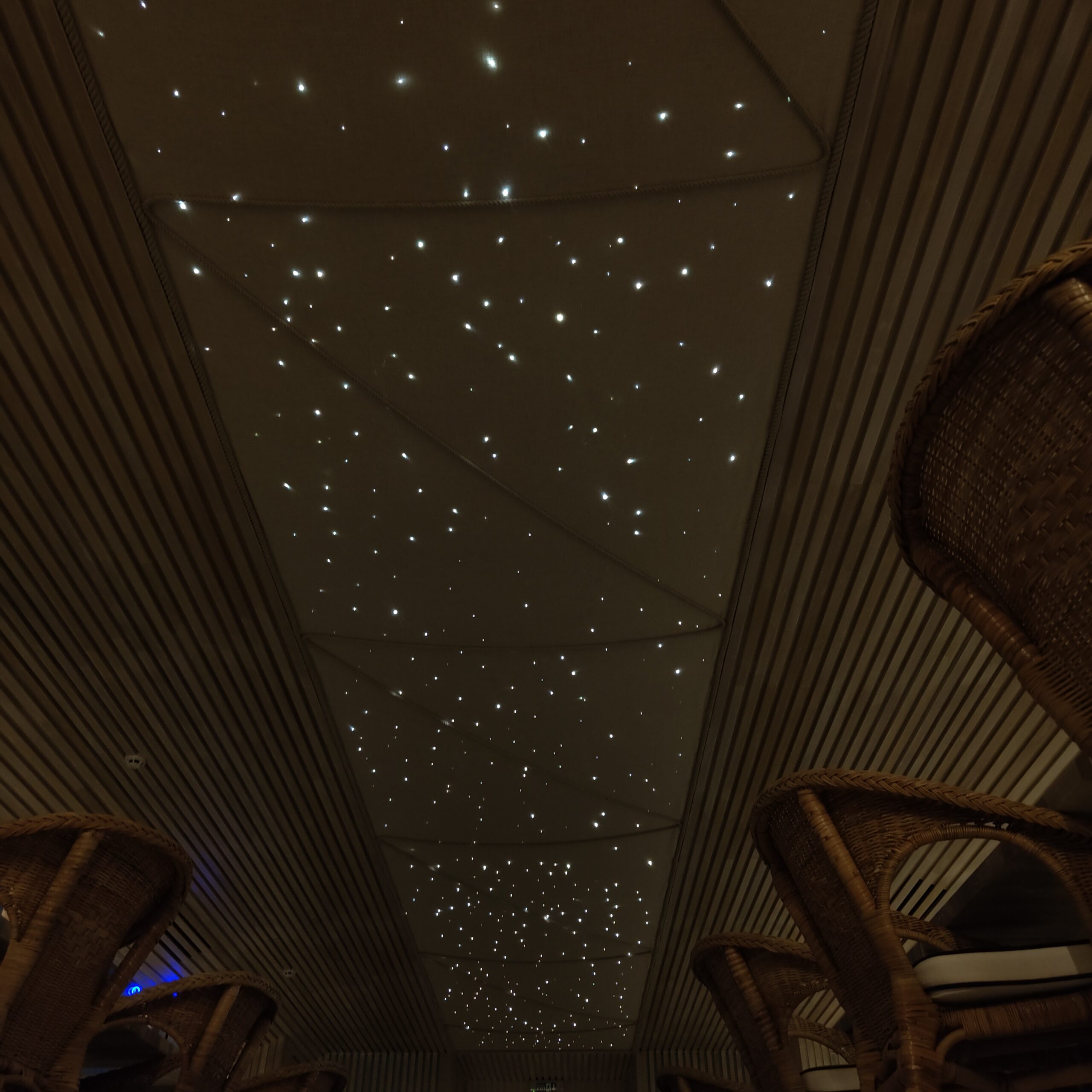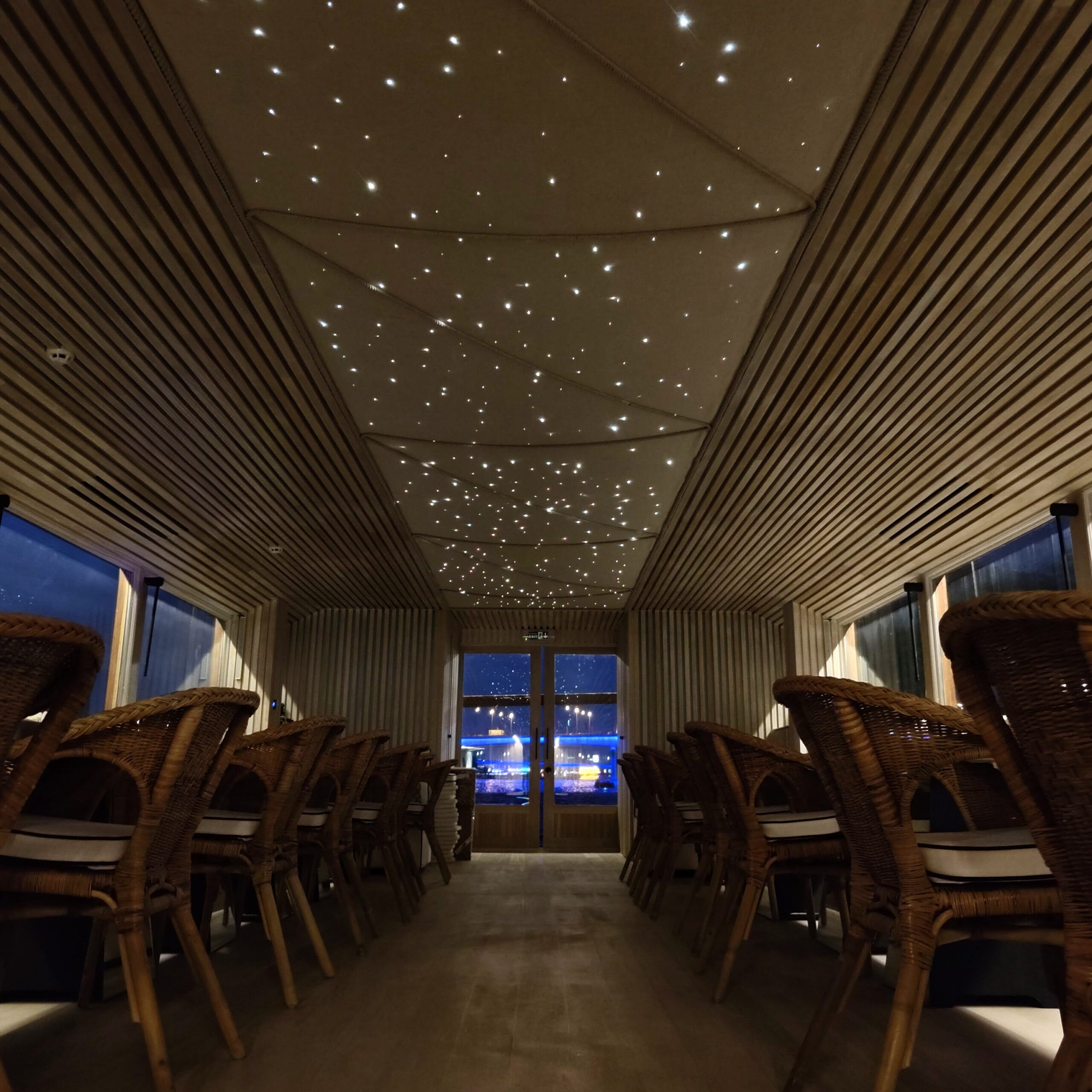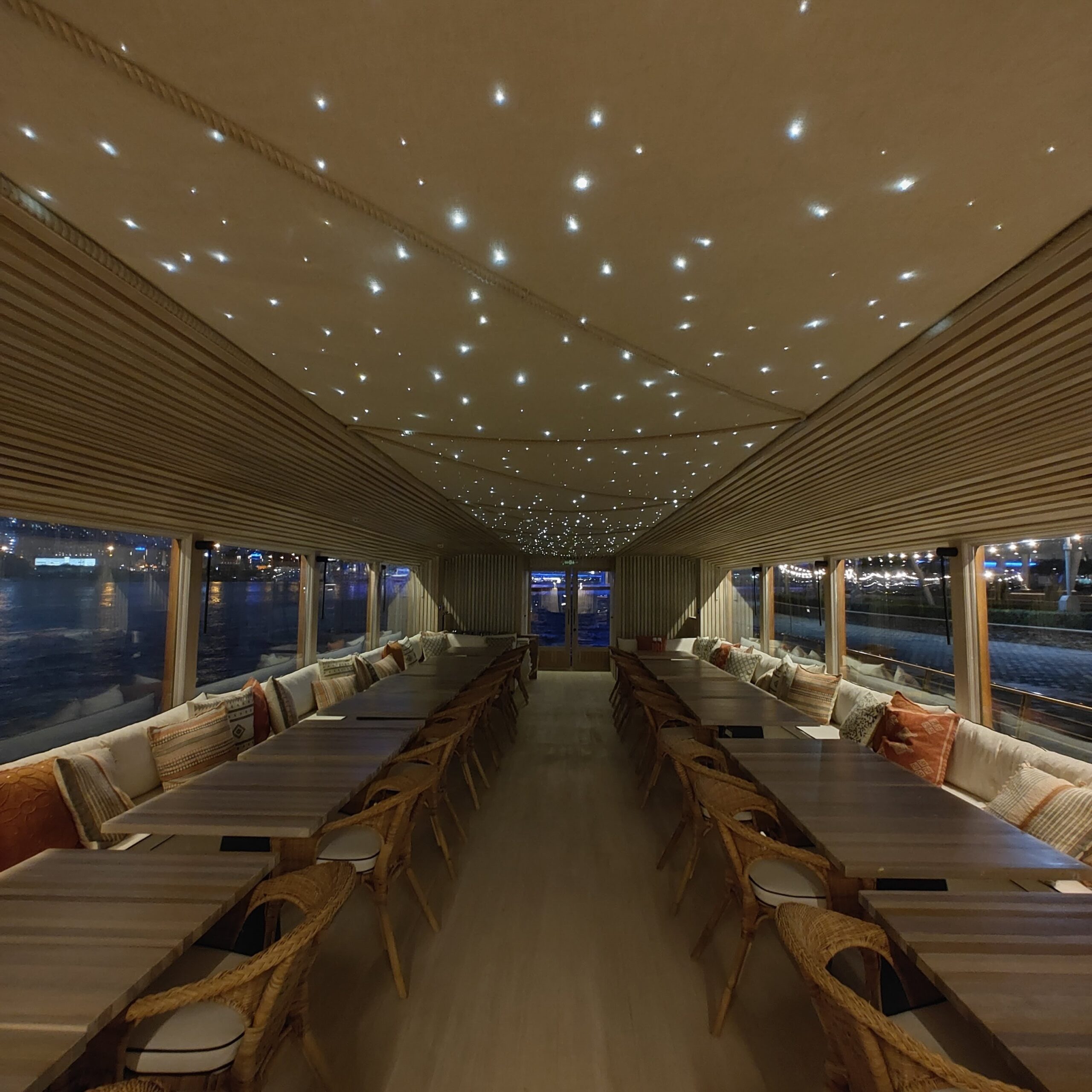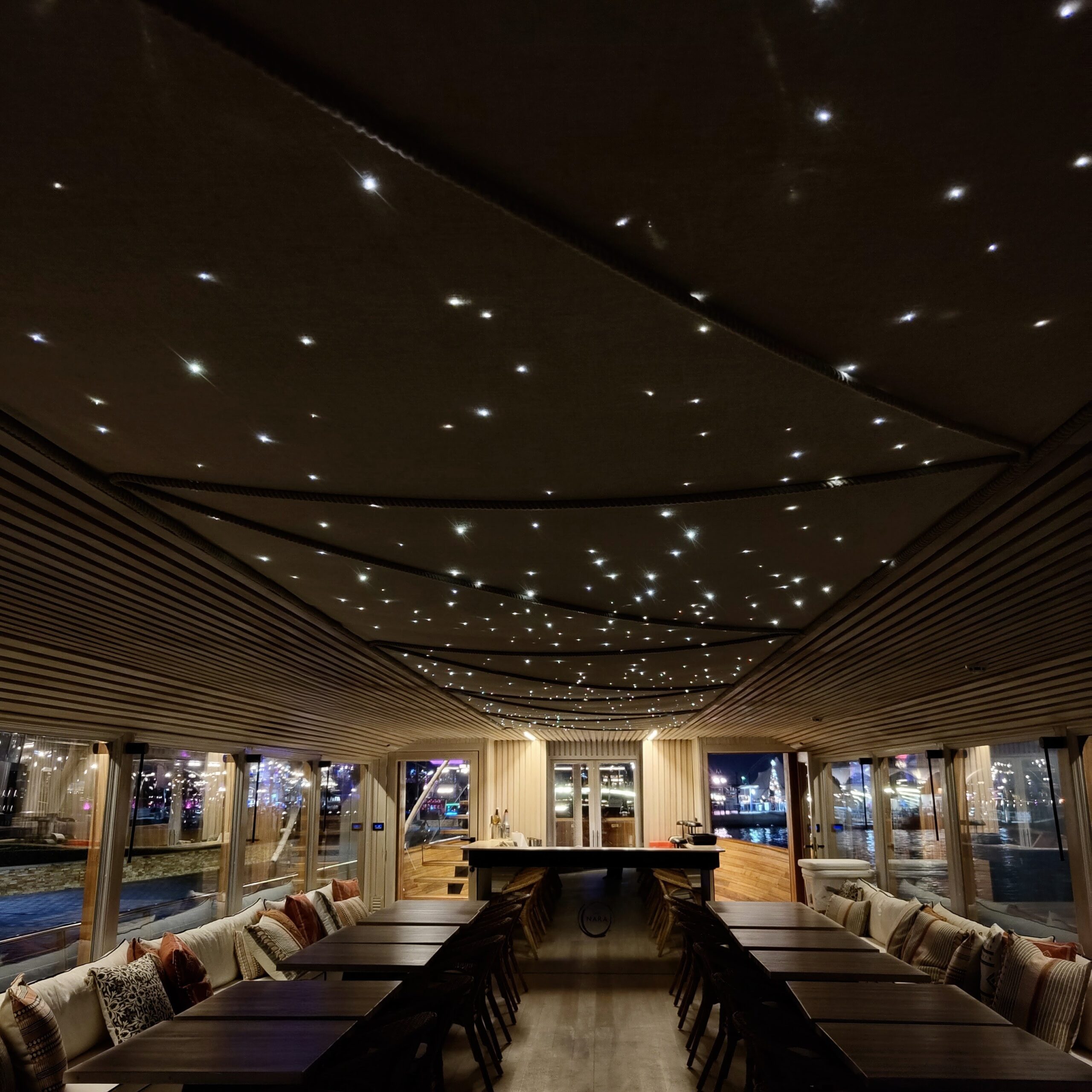 Our Team have installed many starscapes into interior ceiling and covered outdoor ceiling spaces on local vessels, but we had never been commissioned to install one into soft canopies of fabric that would sway with the ocean breezes above a fine dining adventure on the Lady Nara so of course we jumped at the opportunity. The Team combined our specialist knowledge and expertise incorporating raw fibre optic cables into tent and majlis structures with our marine installation protocols and the finished product is a visually stunning cascade of stars beneath the stars.